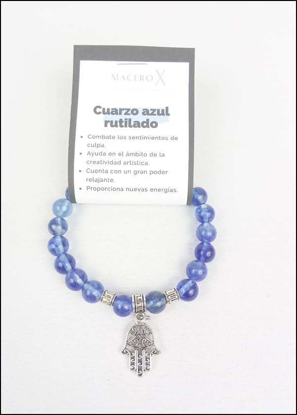 Pulsera de piedras elástica con bolas de Cuarzo azul rutilado de 8mm y colgante de mano de Fátima.